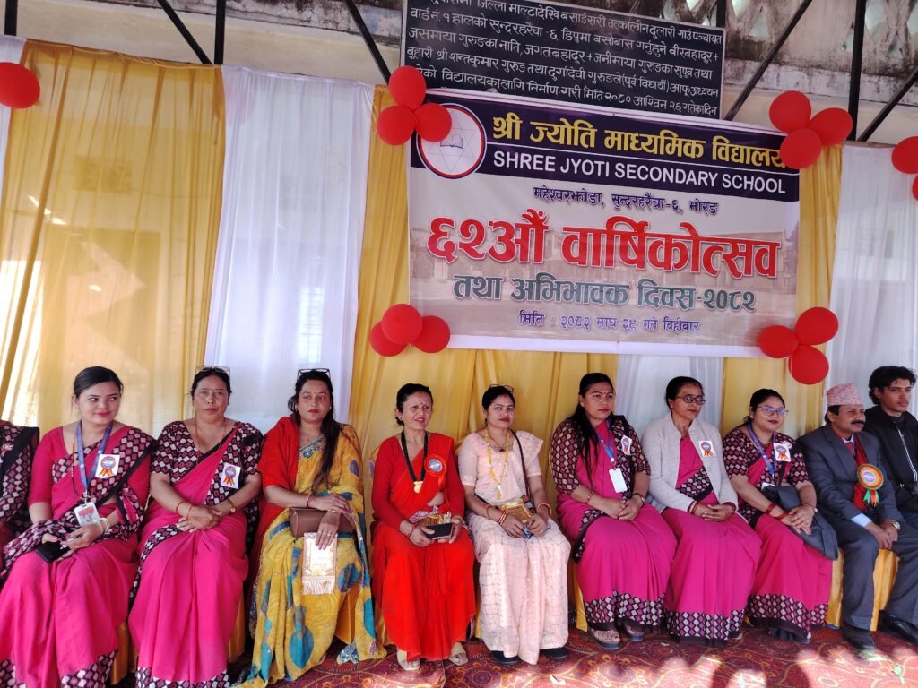 मोरङको सुन्दरहरैँचा नगरपालिका–६ स्थित श्री ज्योति माध्यमिक विद्यालयको ६२औँ वार्षिक उत्सव तथा अभिभावक दिवस बिहीवार भव्यताका साथ सम्पन्न भएको छ। विद्यालय परिसरमा आयोजित कार्यक्रममा सुन्दरहरैँचा नगरपालिकाका नगरप्रमुख केदार प्रसाद गुरागाईंको प्रमुख आतिथ्य रहेको थियो भने विद्यालय व्यवस्थापन समितिका अध्यक्ष अरुण सुवेदीको सभापतित्व रहेको थियो।