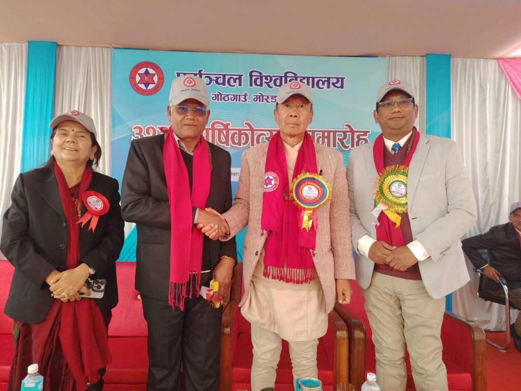 सुन्दरहरैचा/ पूर्वाञ्चल विश्वविद्यालयले आफ्नो स्थापनाको ३२ वर्ष पूरा गरेको अवसरमा शनिबार केन्द्रीय कार्यालय गोठगाउँमा भव्य समारोहका साथ ३२ औं वार्षिकोत्सव मनाएको छ । साता व्यापी रूपमा सञ्चालित विभिन्न खेलकुद तथा रचनात्मक कार्यक्रमहरूको समापनको साथै ३२ औं वार्षिकोत्सव समारोह सम्पन्न भएको हो।